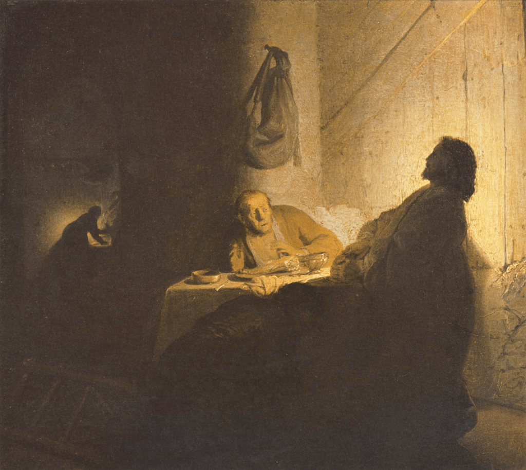 La Vérité “fait semblant” (!!!) et le jour baisse, qu’est-ce à dire ? L’œil corporel voit-il moins bien maintenant que la Vérité a parlé ? N’est-ce pas cela que Platon appelait de ses vœux dans Phédon ? Dans la pénombre, le “signe de contradiction” va se révéler (Lc, 2:34). Personne ne l’a mieux illustré que Rembrandt (non pas à mon avis dans son tableau le plus célèbre, qui se trouve au Louvre, mais dans celui du musée Jacquemart-André).